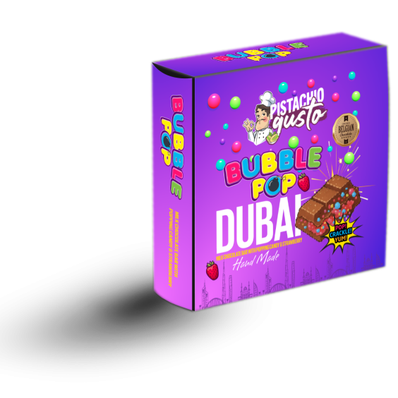 Bubble Pop Dubai Chocolate: Innovative popping candy with luxurious pistachio & chocolate. A fun, gourmet treat from Pistachio Gusto Dubai chocolate exporter for premium Dubai chocolate wholesale Europe.